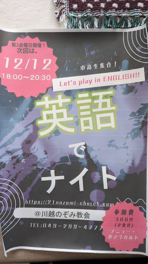 「英語でナイト」は中高生を対象にした集いです。英会話や英語のゲームに挑戦します。会費は300円です。