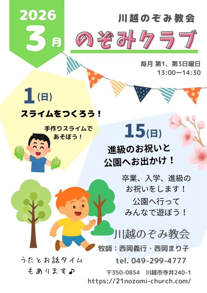 のぞみクラブは小学生までの子供を対象にした集まりで讃美歌を歌い、聖書の話を聞き、楽しいゲームなどをして過ごします。親子での参加も歓迎です。(日付をクリックしてください。)